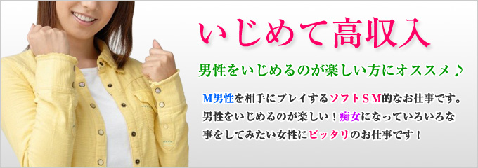 M男君を優しく責めたり、綺麗にお化粧してあげて、カワイイ女の子に「変身」するのをお手伝いするお仕事です。女性が主導権をとって、男性を責めるサービスとなりますので、受け身になることは一切なく、楽しくお仕事ができます。